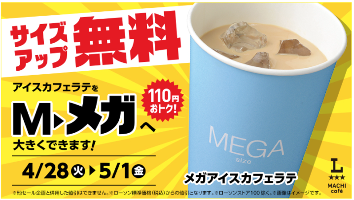 ローソンは2026年4月28日〜5月1日の期間、メガアイスカフェラテお買得セールを実施しています。
