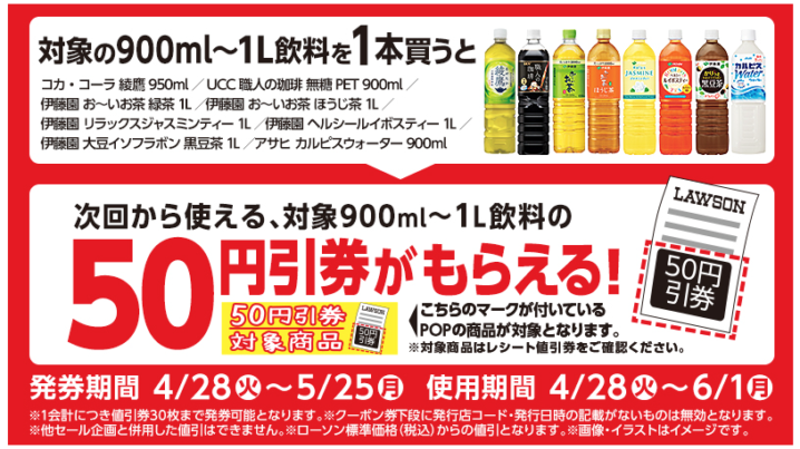 ローソンは2026年4月28日〜5月25日の期間、中容量飲料値引券がもらえるキャンペーンを実施しています。