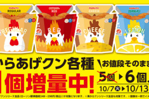 ローソンは2025年10月7日〜13日の期間、からあげクンと海からクンを価格はそのままで1個増量して販売します。 通常5個入りが6個入りになります。 こちらは、からあげクン・海からクン・でからあげクンのすべての商品(24…